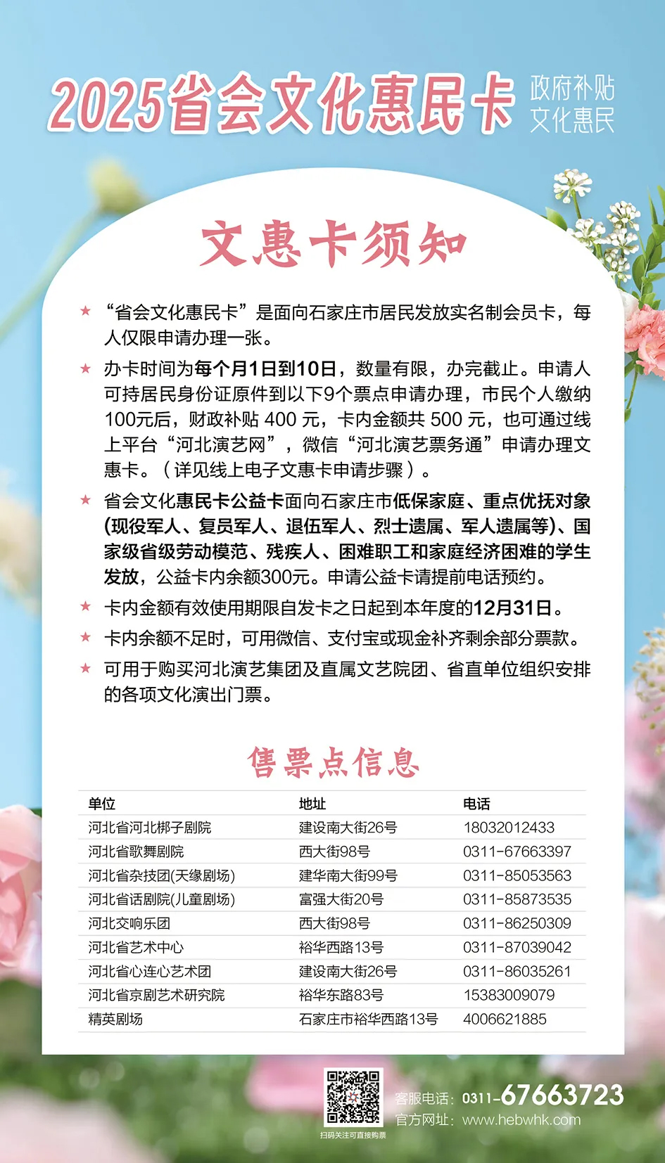 省会文化惠民卡是面向石家庄市居民发放的实名制会员卡,每人仅限申请办理一张。市民个人缴纳100元后,财政补贴400元,卡内金额共500元,金额有效期自发卡之日起到本年度的12月31日。文化惠民卡可用于购买河北演艺集团及直属文艺院团、省直单位组织安排的各项文化演出门票。省会文化惠民卡可在河北梆子剧院,河北省歌舞剧院等9个售票点进行办理。